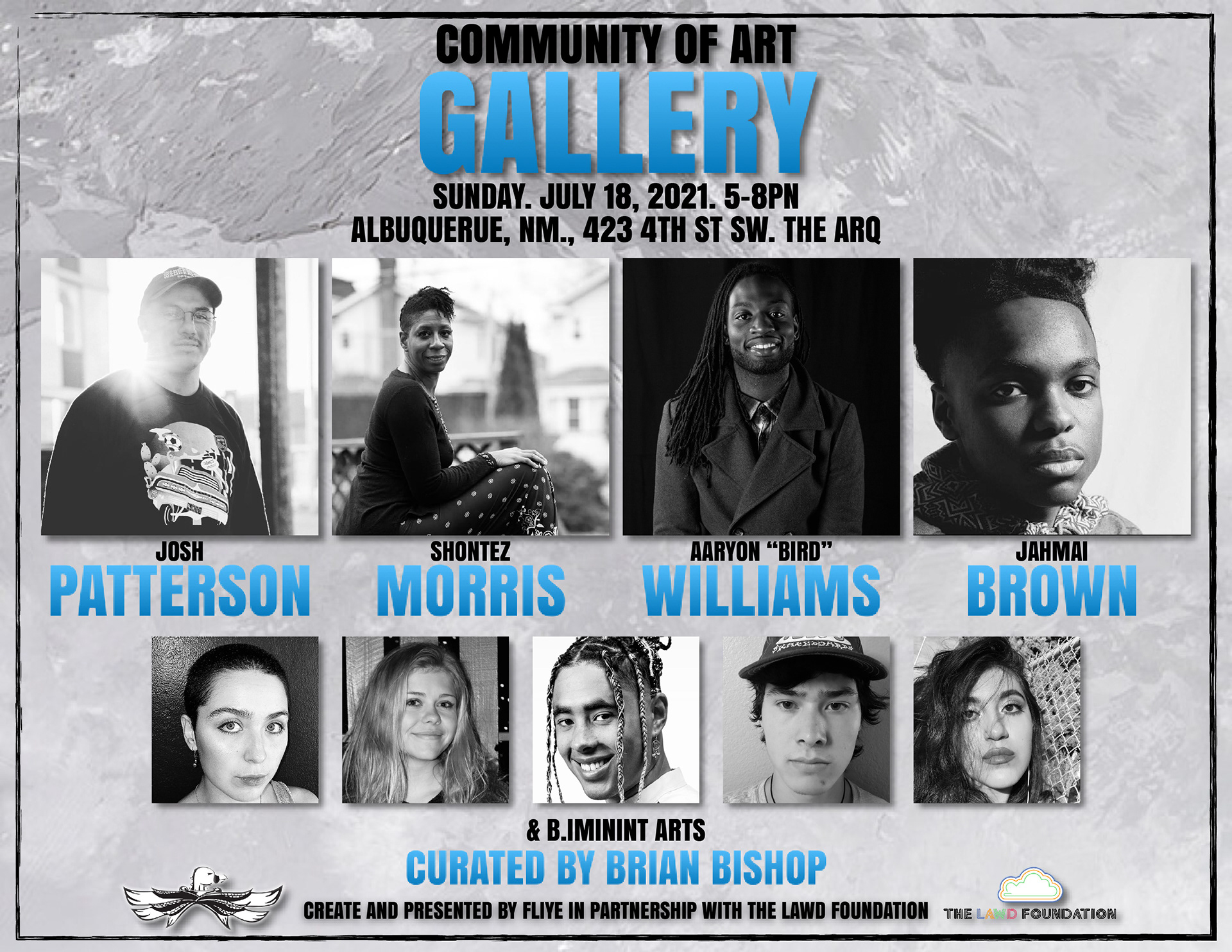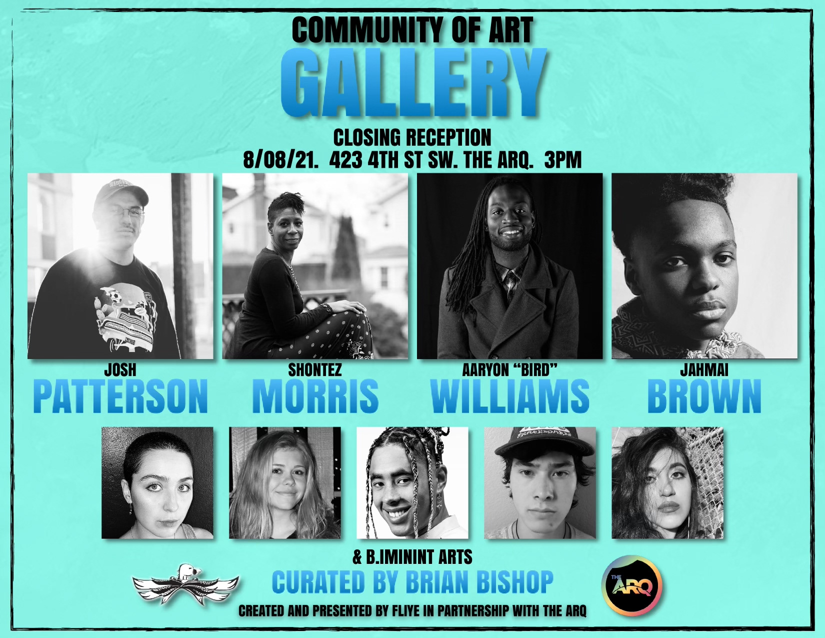Josh Patterson, Shontez Morrison, Aaryon "Bird" Williams, Jamal Brown, Savina Romero, Juliana Wagner, Brian "b." Bishop, Eamon Quigley, and Elena Gonzalez.