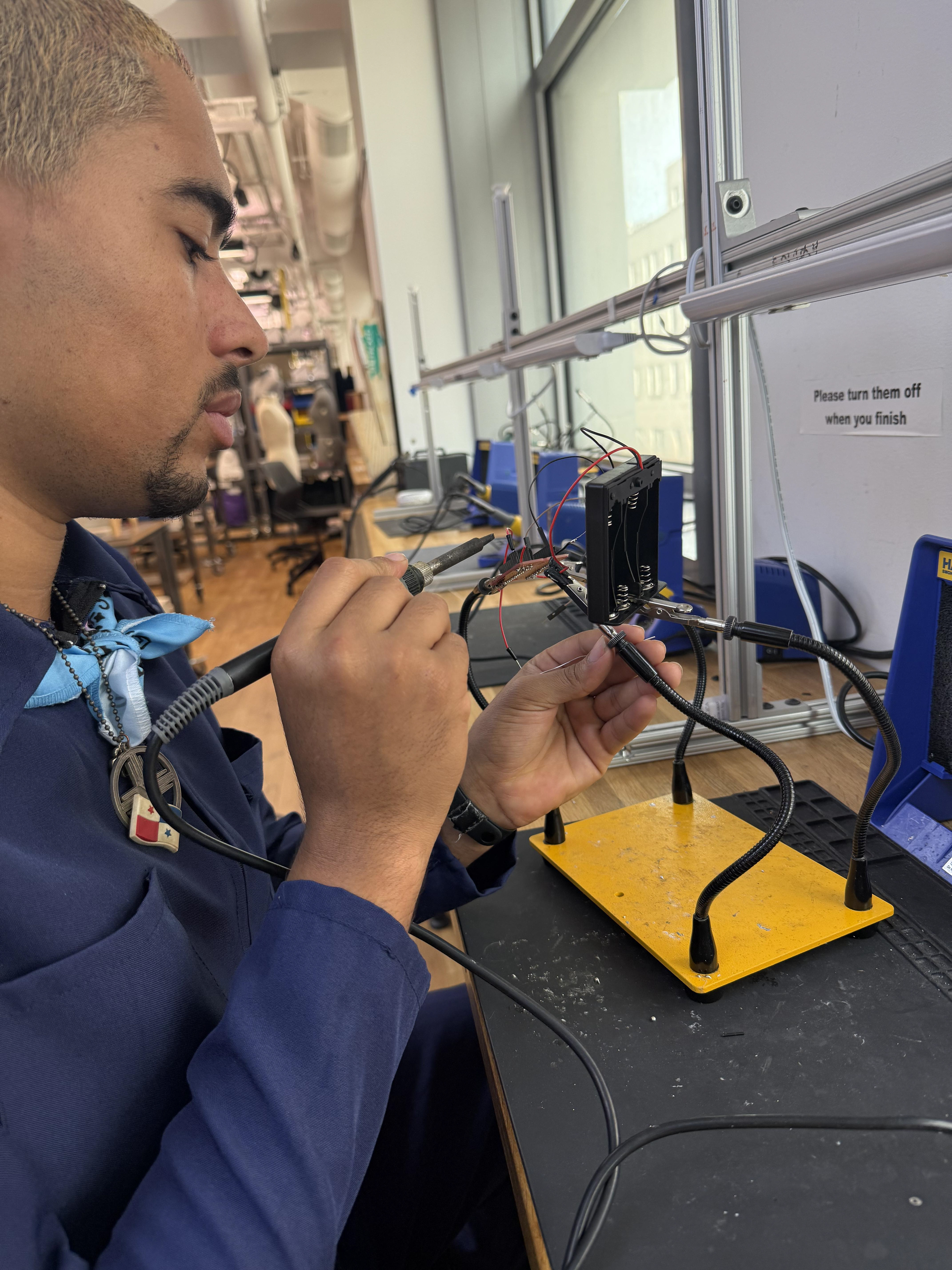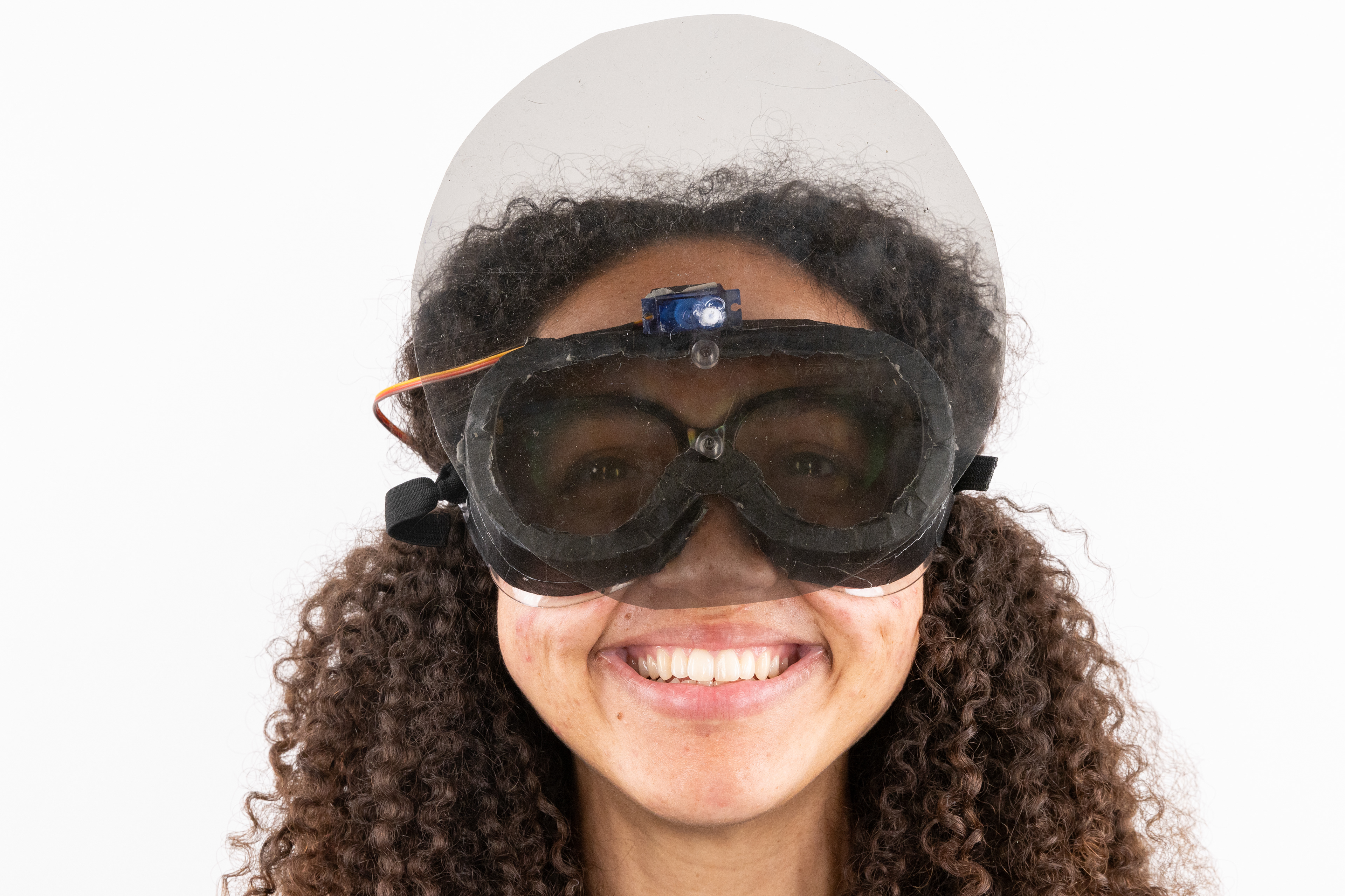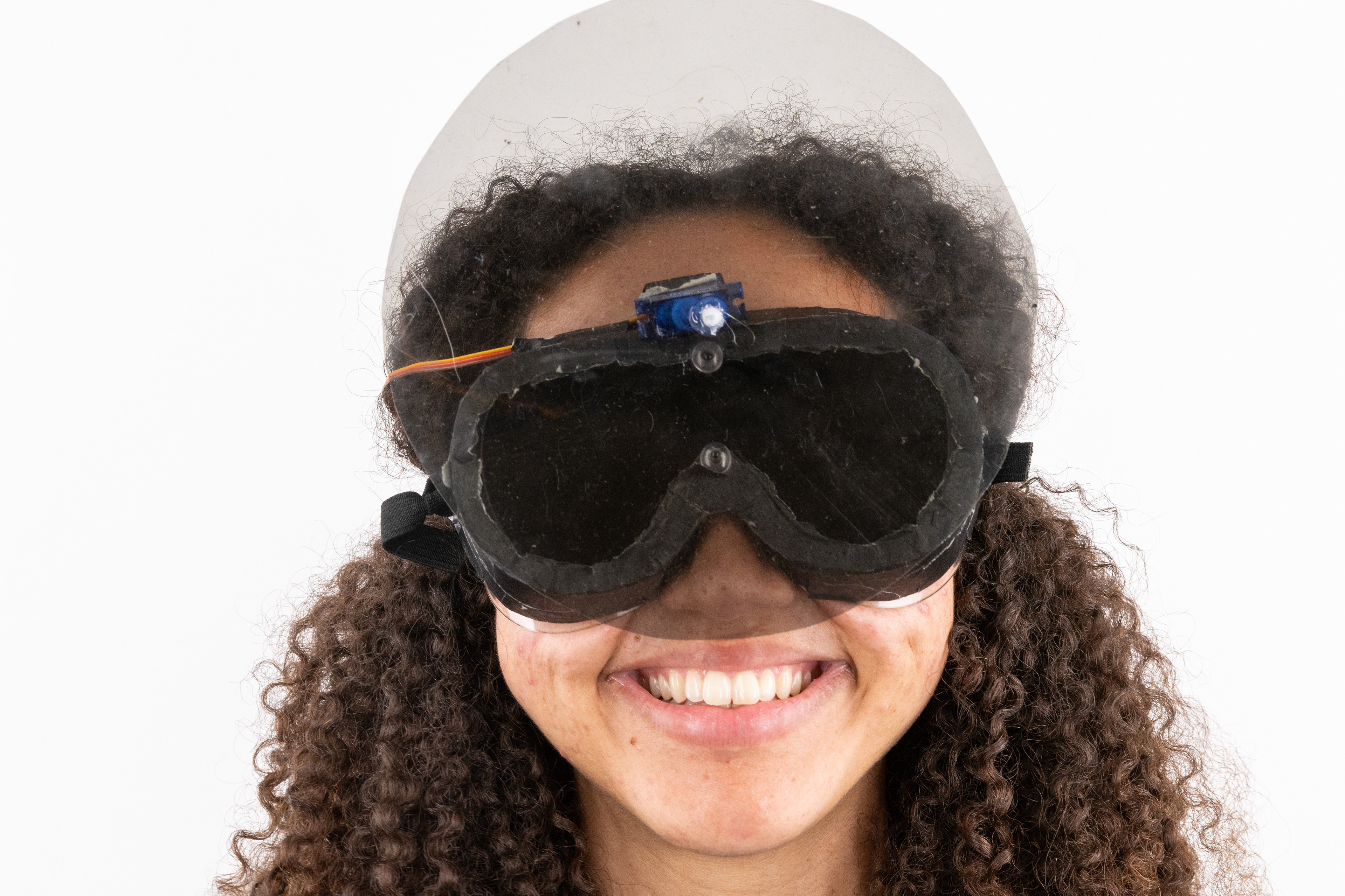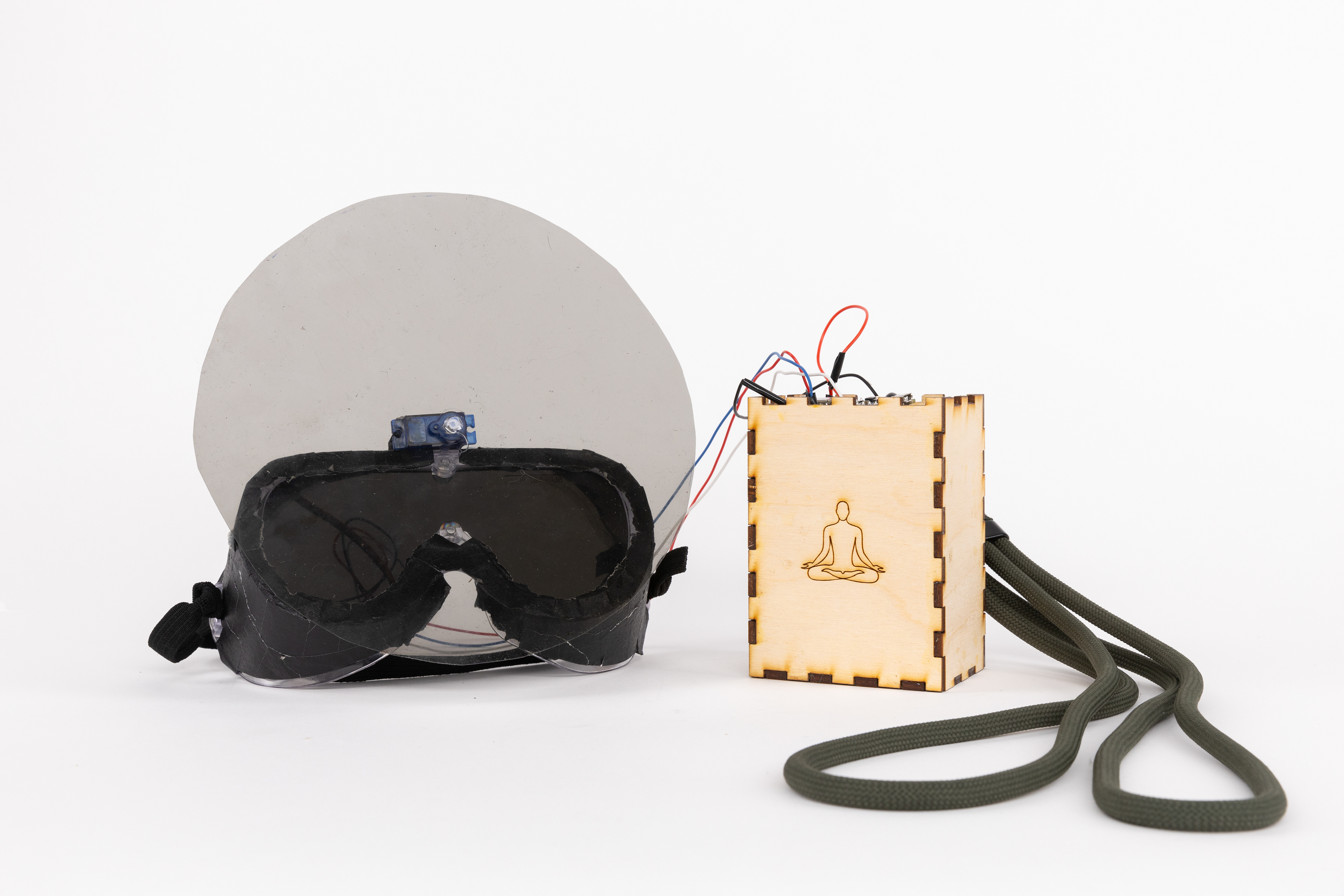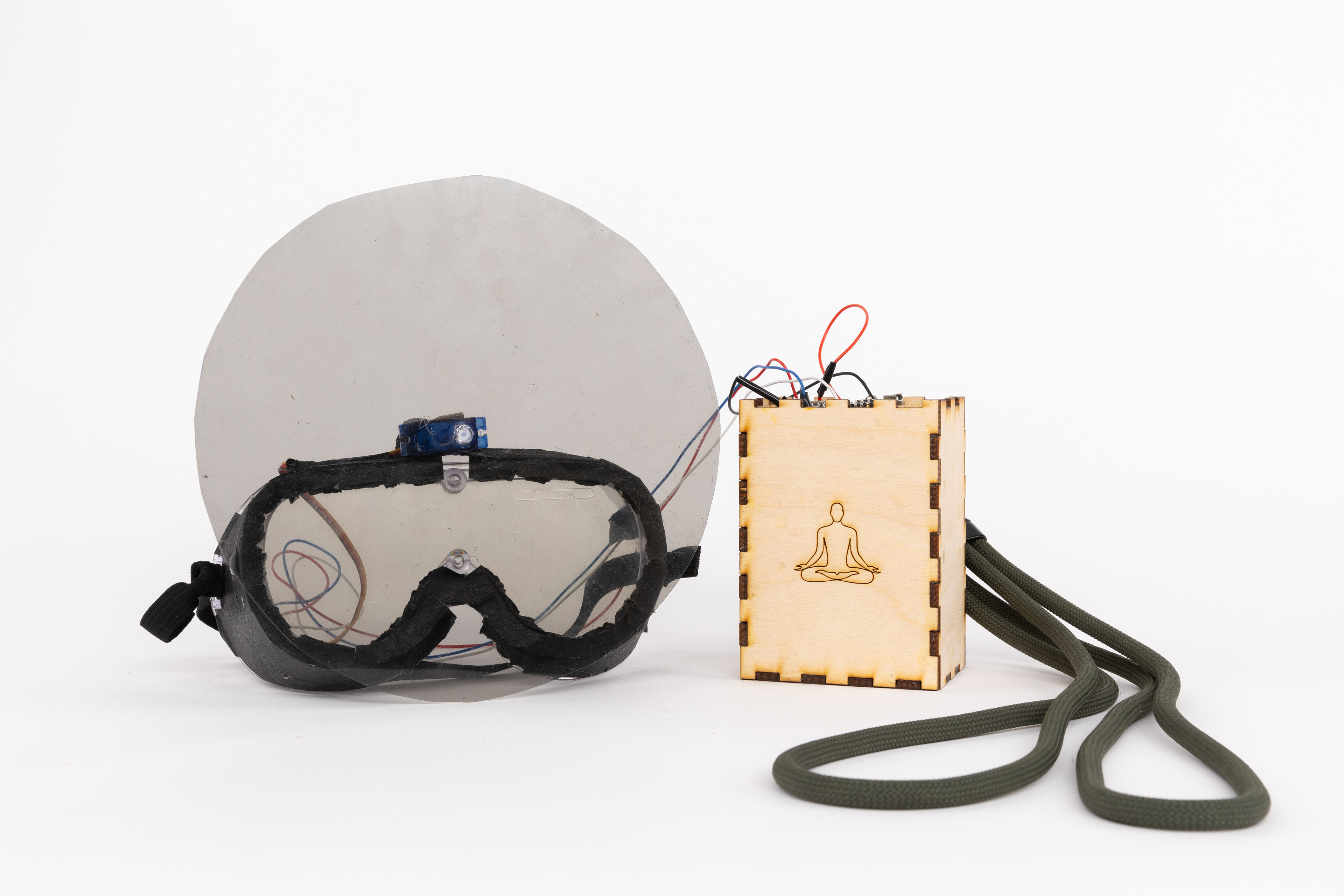 The mechanism for the meditation mask was a polarized lenses mounted on a pair of goggles, driven by a servo motor which was triggered by the microcontroller worn as a necklace and adjusted to their chest. To create this we soldered the components onto a protoboard to keep everything compact enough to wear. After the system calibrates to each user's natural breath, they would be guided through a sequence: four extended breaths to darken the lenses, four to hold in stillness, four to return to light. This was done through small rotations of the polarized lenses as they slowly rotated 90° to darken, and at the close of the session, rotated back to let the light in.