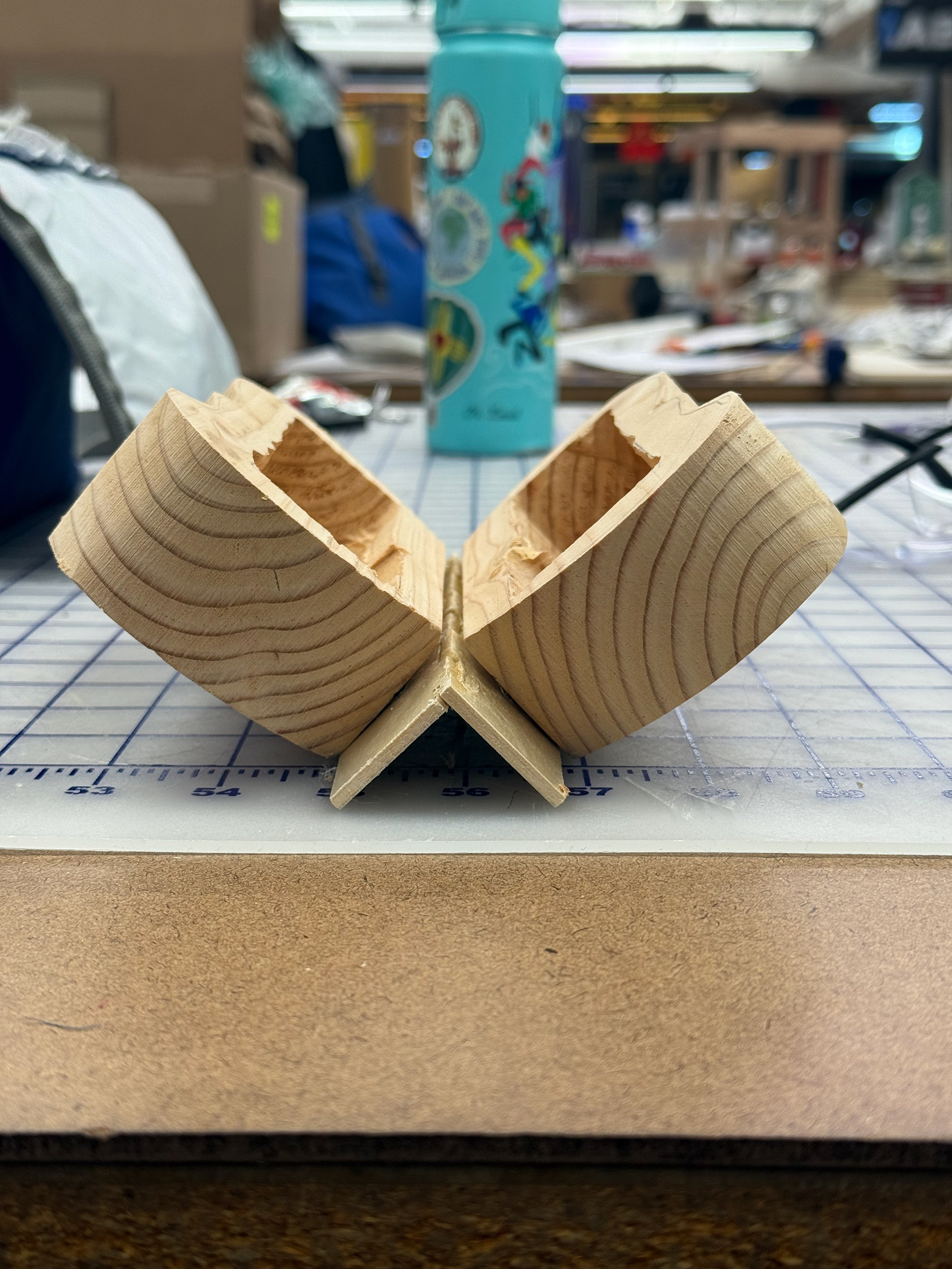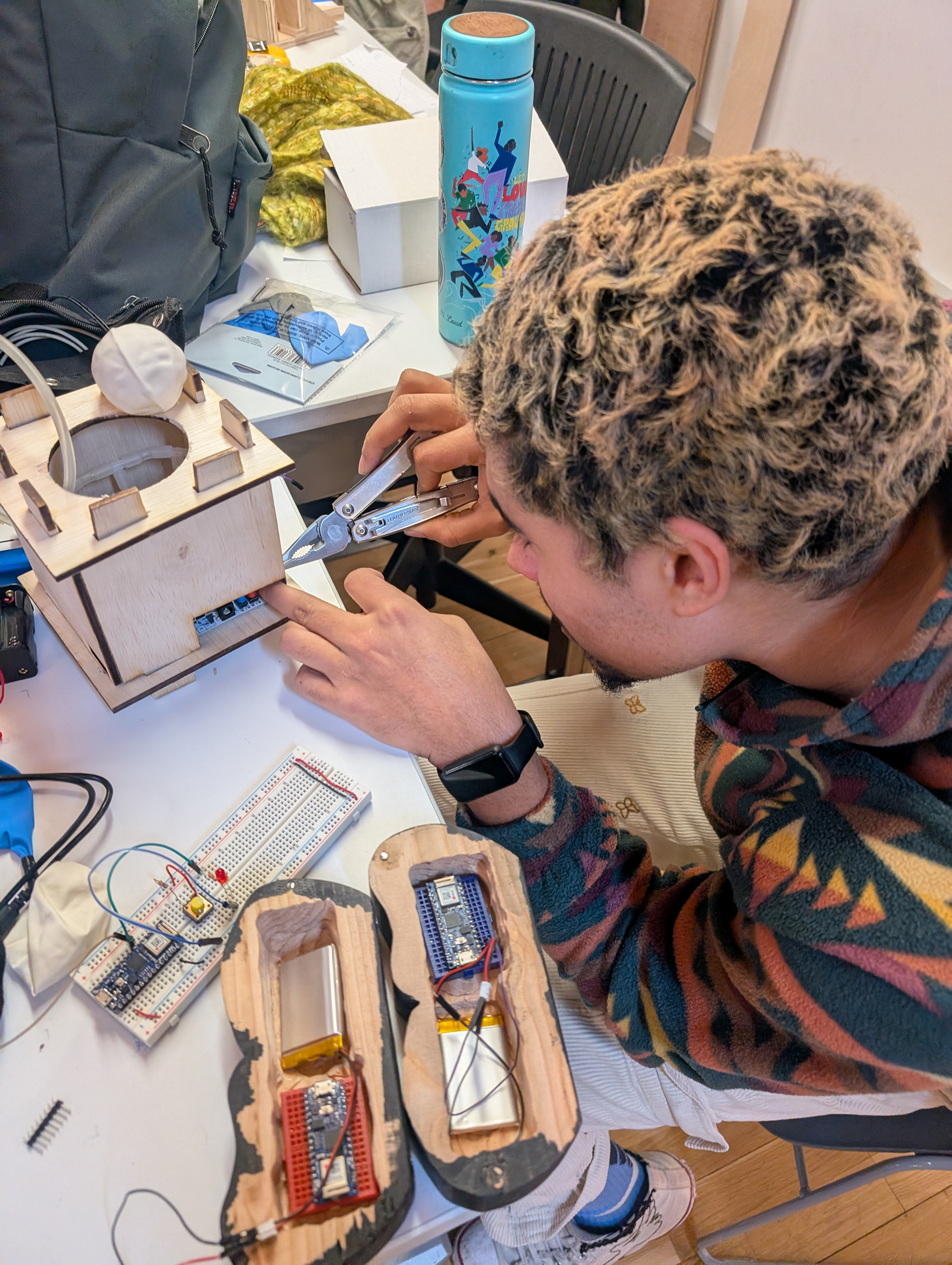 The two hardest problems were power and calibration. A 9V alkaline battery couldn't deliver consistent current to the servo motor. We went through a smaller servo before ultimately moving to four 1.5V alkaline batteries in series for more stable output. To refine calibration we implemented a sliding window using 50 IMU readings, establishing a personal baseline for each user before the session began. The system then detected when breath slowed and deepened, prompting the user to keep going. It worked well for most, but struggled with users who shifted posture mid-session, which became one of the clearest targets for a next iteration.